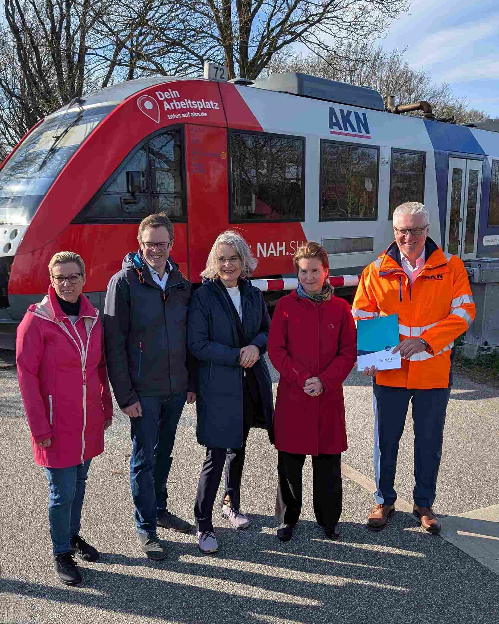 1. stellvertretenden Bürgermeisterin der Gemeinde Henstedt-Ulzburg, Claudia Meyer, dem Landtagsabgeordneten Ole Plambeck und NAH.SH-Geschäftsführerin Birgit Austen am 09. April den Zuwendungsbescheid an AKN Geschäftsführer Matthias Meyer.