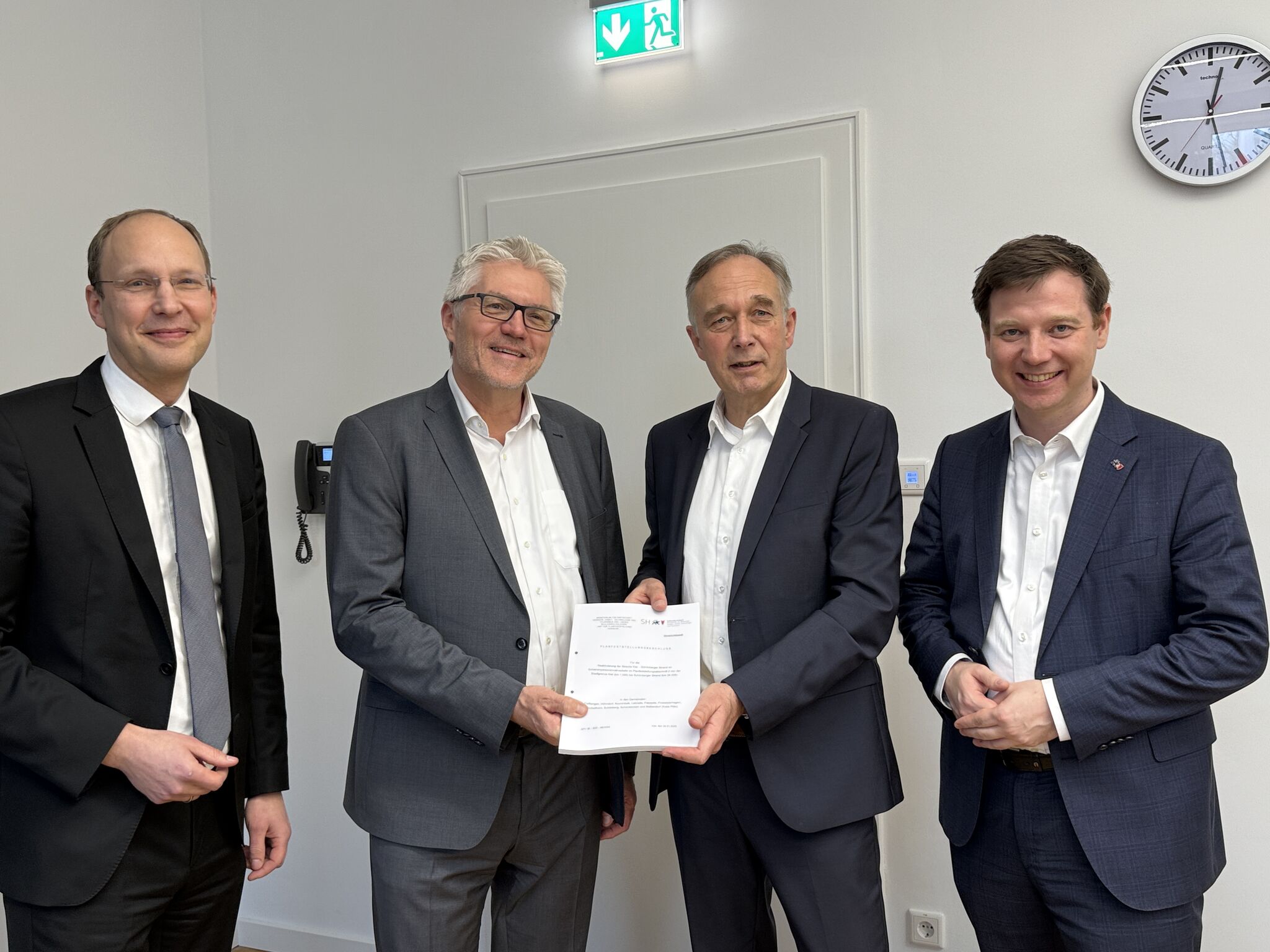 Martin Hamm vom Amt für Planfeststellung Verkehr (APV) überreichte am 06. Februar 2025 dem AKN Geschäftsführer Matthias Meyer den Beschluss im Beisein des ehemaligen Staatssekretärs Tobias von der Heide und NAH.SH GmbH Geschäftsführer Dr. Arne Beck.
